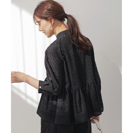 ■デザイン・オリジナルのアイレット刺繍を組み合わせた大人のレースブラウス。・裾のパネルレースが特別感を演出します。・春夏シーズンに、1枚着としても軽い羽織としても着用いただけるデザイン。・袖丈や、前後差をつけたギャザーボリュームにこだわり、立体感のある美しいシルエットに。・前開き釦は二個ずつのこだわり配置で、首元を開けてスキッパー風にも着用いただけます。