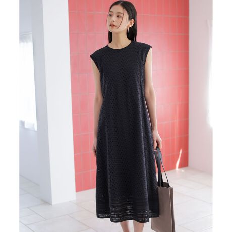 ■デザイン・オリジナルのアイレット刺繍を組み合わせた、大人上品なワンピース。・裾に配置した幅広のパネルレースが全体のアクセントに。・体から離れるAラインシルエットで、軽やかに着用いただけるバランスに仕上げました。・腕を主張しすぎないノースリーブラインと、脇下が開きすぎない設計もこだわりのポイント。・共布リボン付きなので後ろで結んで、ウエストマークするアレンジも可能です。