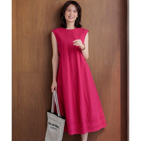 ■デザイン・オリジナルのアイレット刺繍を組み合わせた、大人上品なワンピース。・裾に配置した幅広のパネルレースが全体のアクセントに。・体から離れるAラインシルエットで、軽やかに着用いただけるバランスに仕上げました。・腕を主張しすぎないノースリーブラインと、脇下が開きすぎない設計もこだわりのポイント。・共布リボン付きなので後ろで結んで、ウエストマークするアレンジも可能です。