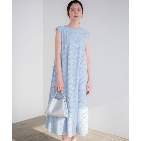 ■デザイン・オリジナルのアイレット刺繍を組み合わせた、大人上品なワンピース。・裾に配置した幅広のパネルレースが全体のアクセントに。・体から離れるAラインシルエットで、軽やかに着用いただけるバランスに仕上げました。・腕を主張しすぎないノースリーブラインと、脇下が開きすぎない設計もこだわりのポイント。・共布リボン付きなので後ろで結んで、ウエストマークするアレンジも可能です。