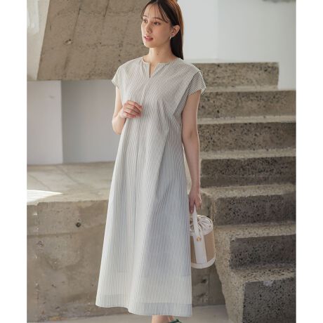 【スタッフコメント】▼身長158cm|着用サイズM (通常着用サイズM)さらっとした素材感で着心地の良さも叶えながら、キーネックや程よいフィット&フレアシルエットでキレイめな印象もくれる万能なワンピースです。夏のお仕事着に是非おすすめしたい1枚です。