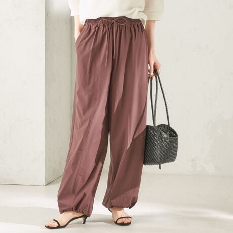 裾のゴムスピンドルを絞るとバルーンパンツ風のシルエットに変化し、スタイリングの幅が広がります。
