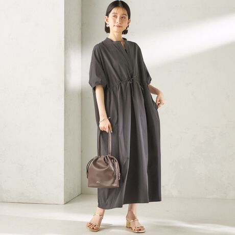 ウエストのドローストリングでシルエットを調整できるタフタワンピース。