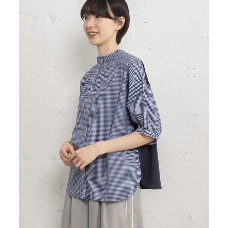 カットソーと布帛生地をドッキングさせたデザイントップス。細巾で控えめなフリルデザインと、ぷっくりとしたパフスリーブがキレイめなスタイルにも使えます。ブラウスのようにきちんと見えながら、カットソー素材の柔らかな肌なじみが着やすいポイント。前後どちらでも着用できるフレキシブルなアイテムです。