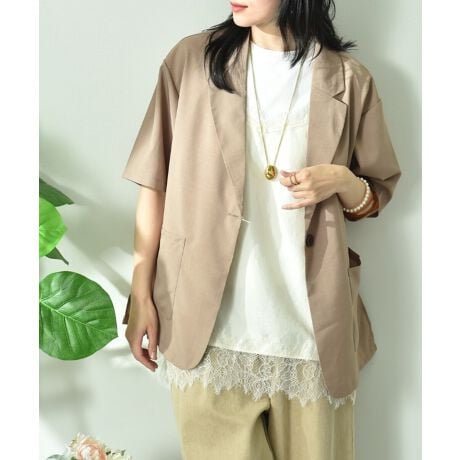 さらりとした肌さわりが特徴のリネンライクな素材で作られたジャケット。ボトムスや体系を選ばず着まわしやすい着丈にこだわった1枚です。1つボタン開きのすっきりしたシルエットは女性らしく、インナーも合わせやすいのがポイントです。