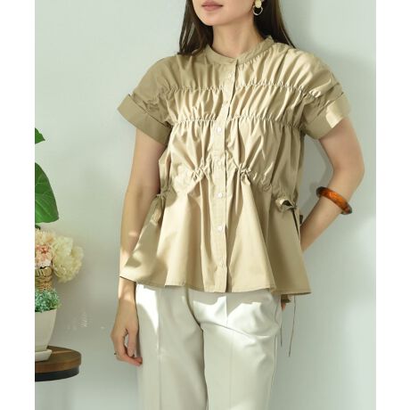 女性らしい優しいスタイルが出るよう、ギャザーのボリュームシルエットにこだわりました。程よくハリ感のあるコットン混の素材を使用し、透け感もほとんどなく、シワが目立ちにくいのも◎