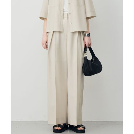 ■デザインクロスタック入りのワイドストレートパンツです。大胆なクロスタックですがセンタープレスできれいめな印象になっています。後ろウエストベルトにはゴムが入っているためイージーな穿き心地も魅力です。同素材の5分袖シャツとのセットアップ着用はもちろん、お手持ちのトップスやジャケット合わせでシーンレスに活躍します。
