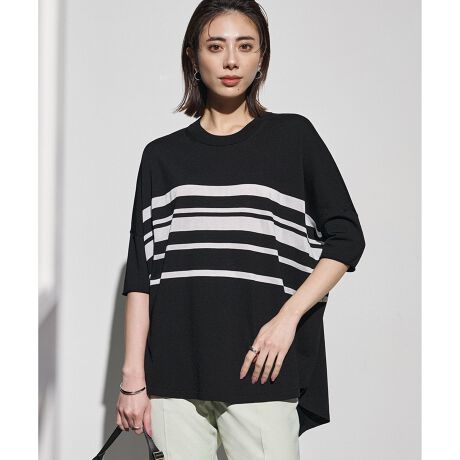 ■デザインブライト素材のラインボーダーをランダムに入れ、ICBらしいエッジの効いたプルオーバーニットです。ワイドシルエット、前後差のあるラウンドシルエットながら袖はすっきりとさせることで体型カバーを叶えつつ、抜け感のあるスタイリングが叶います。 夏もさらっと着用できる機能性素材ながら、ブルゾンやカーディガン等のインナーとしても使いやすく、肌寒さの残る時期から真夏まで長い時期活躍します。