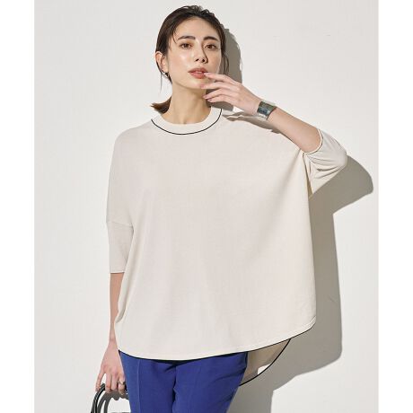 ■デザインTシャツの様な気軽さと、ニットらしい上品な雰囲気を併せ持った半袖プルオーバーニットです。ワイドシルエット、前後差のあるラウンドシルエットながら袖はすっきりとさせることで体型カバーを叶えつつ、抜け感のあるスタイリングが叶います。 袖のデザインがコンパクトなため、ジャケットやカーディガンを羽織っても袖がもたつかず、オフィスシーンでのインナーとしても着用できるのも嬉しいポイントです。カラーは衿ぐりと裾、センターバックには繊細な配色ラインをプラスしたトープ×ブラックライン(142)、ブラック×トープライン(105)、WEB限定のランダムなラインボーダーが着映えるトープ×ブラックボーダー(242)、サックスグレー×ブラックボーダー(273)の4色展開です。