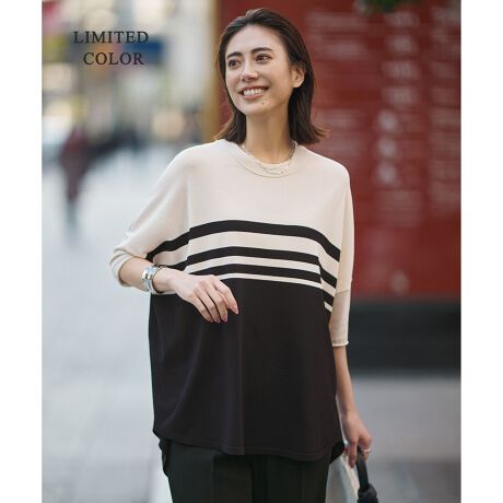 ■デザインTシャツの様な気軽さと、ニットらしい上品な雰囲気を併せ持った半袖プルオーバーニットです。ワイドシルエット、前後差のあるラウンドシルエットながら袖はすっきりとさせることで体型カバーを叶えつつ、抜け感のあるスタイリングが叶います。 袖のデザインがコンパクトなため、ジャケットやカーディガンを羽織っても袖がもたつかず、オフィスシーンでのインナーとしても着用できるのも嬉しいポイントです。カラーは衿ぐりと裾、センターバックには繊細な配色ラインをプラスしたトープ×ブラックライン(142)、ブラック×トープライン(105)、WEB限定のランダムなラインボーダーが着映えるトープ×ブラックボーダー(242)、サックスグレー×ブラックボーダー(273)の4色展開です。