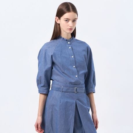 デニム調の軽いコットンリネン素材のフリルバンドカラーブラウス。