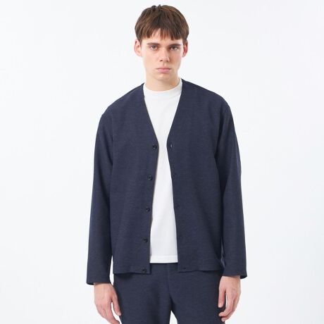 メッシュ組織で通気性が高く、快適な着心地のノーカラーカーディガン