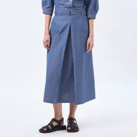 デニム調のコットンリネン素材を使用したベルト付きスカート。フロントの大きなインパーテッドタックがデザインポイントです。