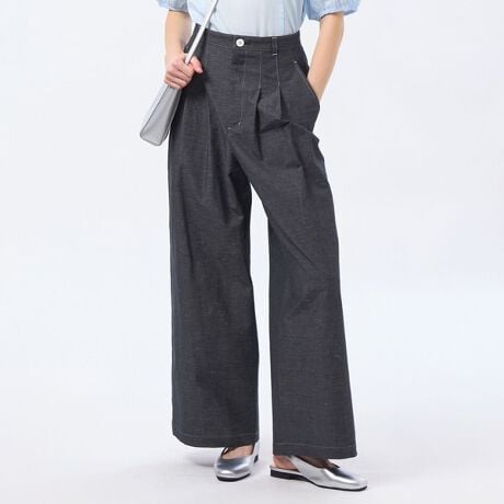 デニム調のコットンリネン素材を使用したハイウエストワイドパンツ。ピンタック使い、配色ステッチがデザインポイントです。