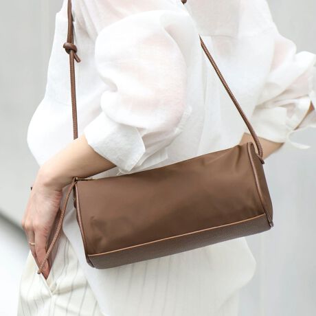 ・素材には、上品な光沢を放つナイロンと、使うほどに味わい深くなる牛革を使用。異素材の組み合わせが、コーディネートにこなれ感をプラスしてくれます。