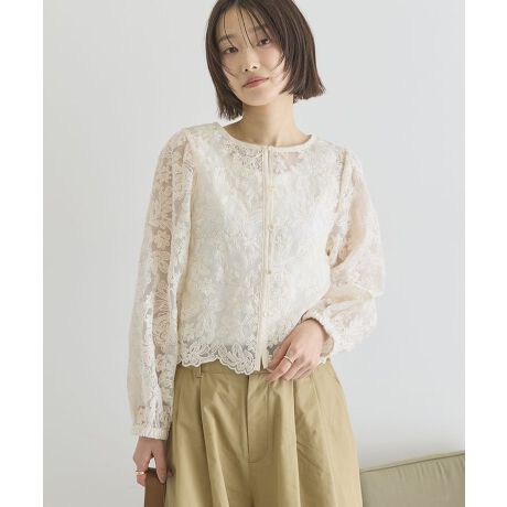 前後で楽しむ、軽やかシアーレース繊細なレース素材が上品な透け感を演出するシアーブラウスです。前後2WAY仕様で、ボタンを前にして羽織り風に、後ろにしてシンプルなトップスとしても着用できます。その日の気分やコーディネートに合わせて印象を変えられるのが魅力です。程よいシアー感が抜け感をプラスし、重たくなりがちなスタイリングも軽やかに仕上がります。ふんわりとした袖デザインが腕まわりをやさしくカバーし、女性らしいシルエットを引き立てます。デニムと合わせた大人カジュアルから、きれいめボトムとの上品コーデまで幅広く活躍する万能アイテムです。透け感[あり]