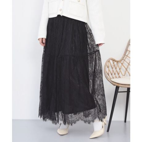繊細なひげレースを贅沢に切り替えたロングスカートで、動くたびにふわりと揺れる軽やかさが魅力。