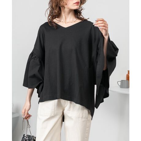 ドロップショルダーとギャザースリーブが特徴的なカットソー。