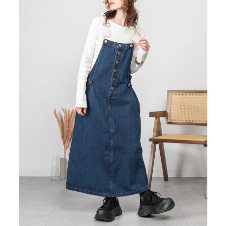 程よい厚みの10オンスデニムで、ゆったりとしたマキシ丈が女性らしいシルエットを作り、カジュアルながら上品な印象を与えます。