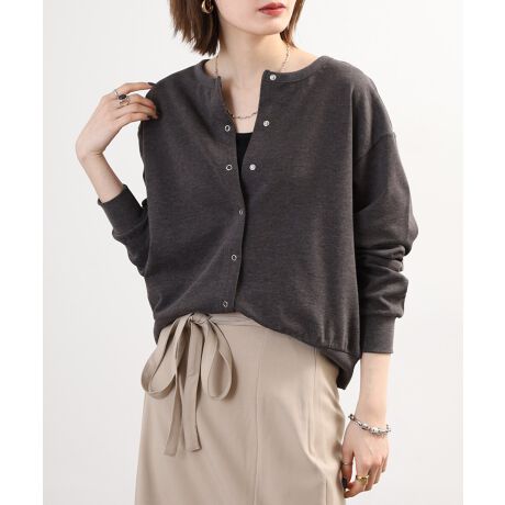 フロントはスナップボタン仕様で、開けて軽く羽織るのはもちろん、閉じてプルオーバー感覚で着こなすのもおすすめ。首まわりはクルーネックですっきりとしており、インナーとの組み合わせもしやすく、顔まわりをすっきり見せたいときにも取り入れやすいデザインです。