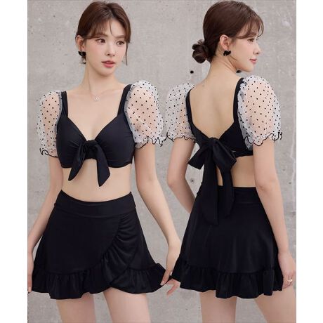 リボンと透け感パフスリーブが可愛いブラとフリルスカートで女性らしく可愛さ満点のビキニ♪