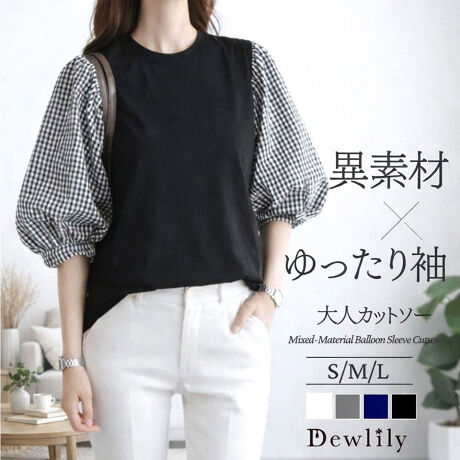 シンプルなカットソーに異素材スリーブを組み合わせたデザイン。