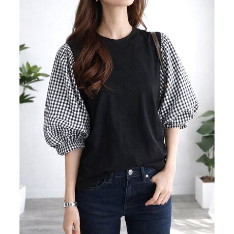 シンプルなカットソーに異素材スリーブを組み合わせたデザイン。