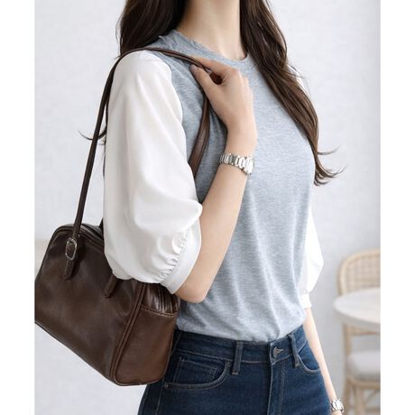 シンプルなカットソーに異素材スリーブを組み合わせたデザイン。