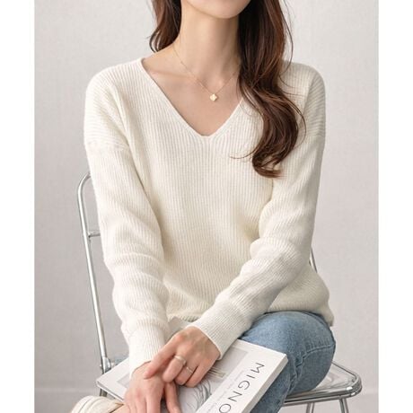 すっきりとしたVネックデザインが印象的なニットトップス。