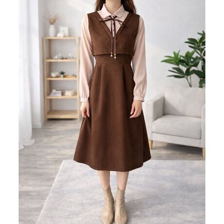 ブラウスとジャンパースカートを重ねたようなレイヤード風デザイン。