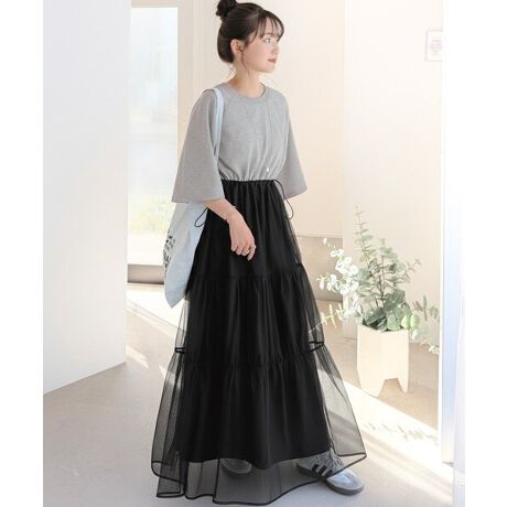 Tシャツにチュールロングスカートをドッキングした春夏にぴったりな1枚☆