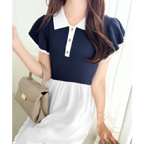 【mily bilet】スタイルアップの極み!フィット&フレアな大人ポロ襟ドッキングワンピ(半袖)