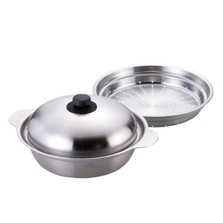 [型番:323151]【デザイン】●使いやすさにこだわったお手入れ簡単な卓上鍋と蒸し台のセットです。●絞り、スピニング、研磨など、磨き抜かれた数々の匠の技によって作られています。●丈夫で保温力に優れたステンレス製です。●オール熱源に対応しています。【スペック】サイズ/約幅34×奥行28.5×高さ14.5cm重量/約800g内容量/1セット(鍋、蓋、蒸し台)材質/18-0ステンレス生産国/日本製熱源/IH・ガス火両対応