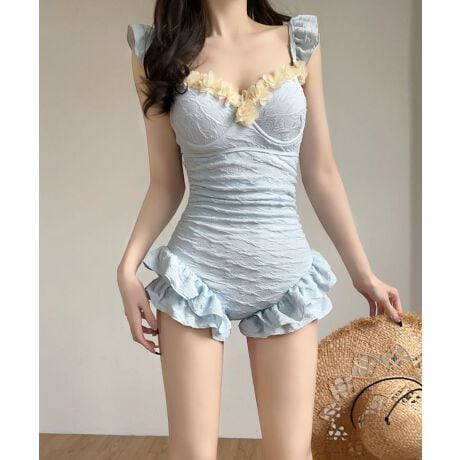 肩と脚まわりにあしらったフリルが、甘さを添えながら女性らしいラインを引き立てます。