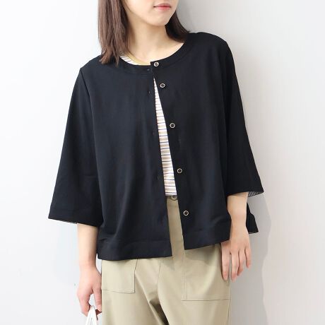 6分袖のデザインで、腕周りを程よくカバーしつつ軽やかな印象を演出します。