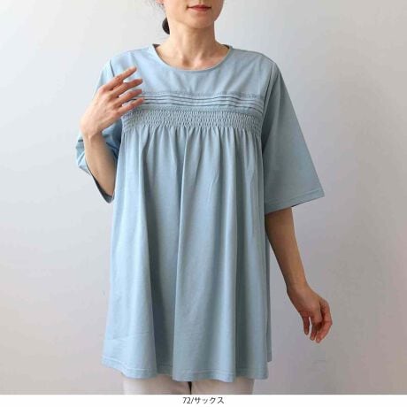 Tシャツ感覚で楽に着られるのに、ブラウスのように華やかなので、普段使いからちょっとしたお出かけまで幅広く活躍します。