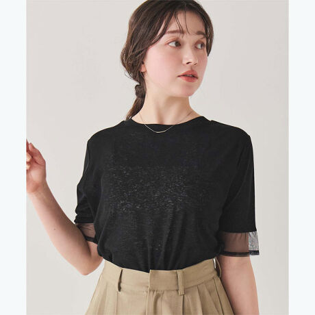 ・袖口のシアー切替がポイント。さりげない肌見せで女性らしさが高まるカットソートップス