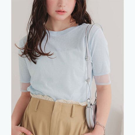 ・袖口のシアー切替がポイント。さりげない肌見せで女性らしさが高まるカットソートップス
