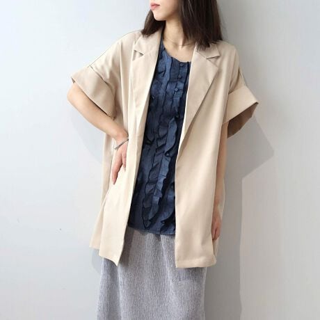 テーラードの端正な表情に、ドルマンスリーブのゆったりとしたニュアンスを融合させたハーフスリーブジャケットです。