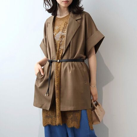 テーラードの端正な表情に、ドルマンスリーブのゆったりとしたニュアンスを融合させたハーフスリーブジャケットです。