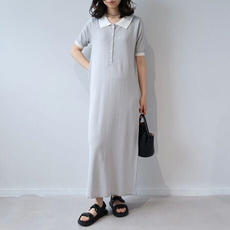スポーティなポロシャツのディテールをマキシ丈のニットワンピースに落とし込んだ、旬のムード漂う1着です。