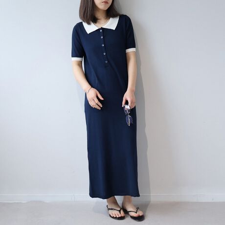 スポーティなポロシャツのディテールをマキシ丈のニットワンピースに落とし込んだ、旬のムード漂う1着です。