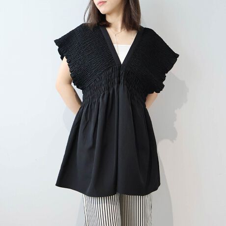 立体的なシルエットが品よく映える。大人の甘さを軽やかに纏う、Vネックのシャーリングチュニック。