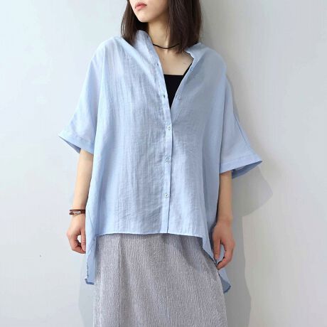 前開き仕様のため、ボタンを閉めて主役トップスとして着るのはもちろん、夏の羽織りとしても重宝する汎用性の高いデザインです。