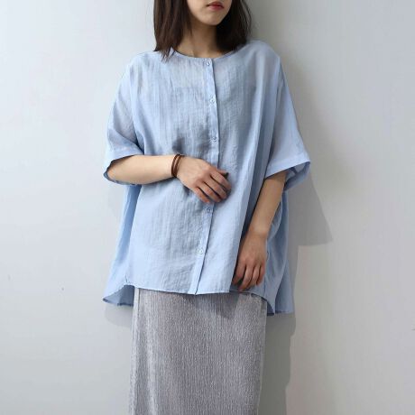 前開き仕様のため、ボタンを閉めて主役トップスとして着るのはもちろん、夏の羽織りとしても重宝する汎用性の高いデザインです。