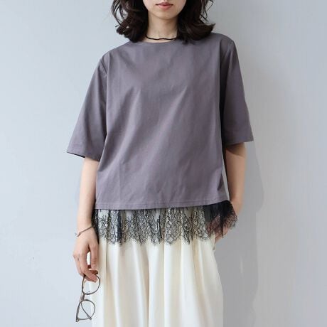 シンプルなTシャツの裾に、繊細なレースを贅沢に施し、1枚で着映える価値観ある1枚に仕上げました。