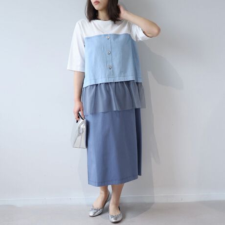 シンプルなカットソーワンピースに、デニムのビスチェをドッキングした遊び心あふれるデザインです。