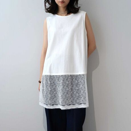 【M〜5L】【接触冷感】シルケット天竺レース切替ノースリチュニック