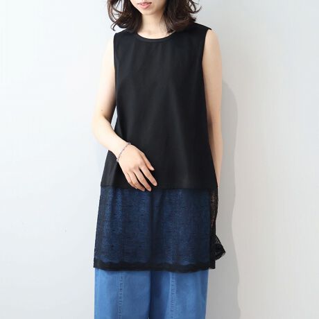 【M〜5L】【接触冷感】シルケット天竺レース切替ノースリチュニック