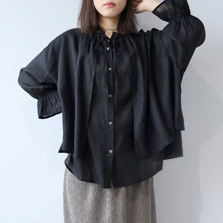 フロントの紐を絞ることで襟元に柔らかなギャザーが生まれ、お好みのニュアンスで表情を変えて楽しめます。